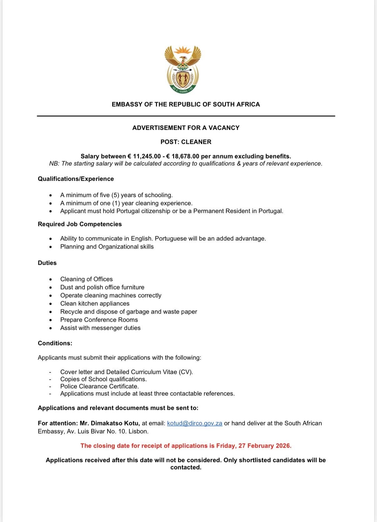 The Embassy is hiring 1 Receptionist and 1 Cleaner.